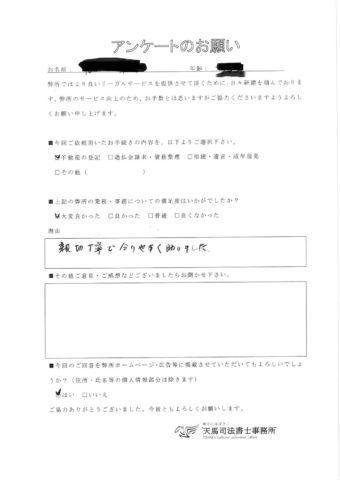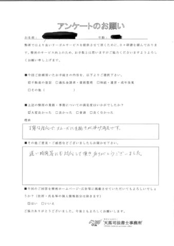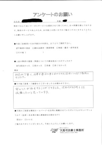 「対応が丁寧で、法律や登記のことも分かりやすく説明していただき勉強になりました。」